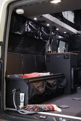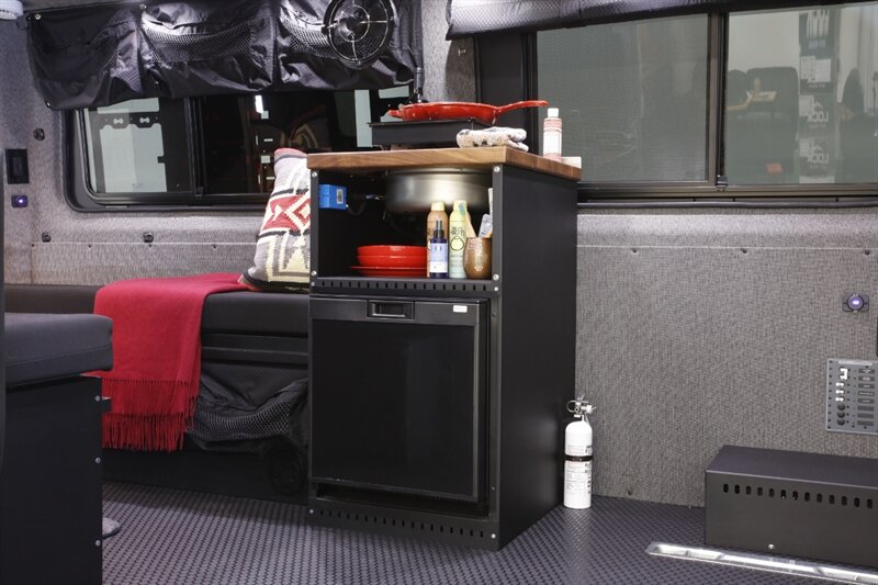 • Sink, portable induction cooktop, refrigerator, shower off the back, dry flush toilet
