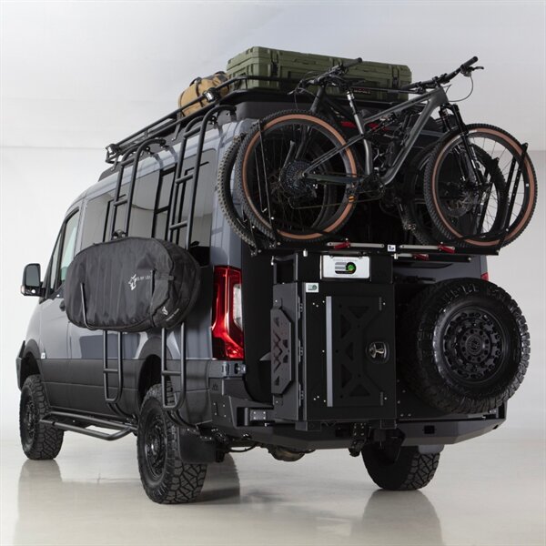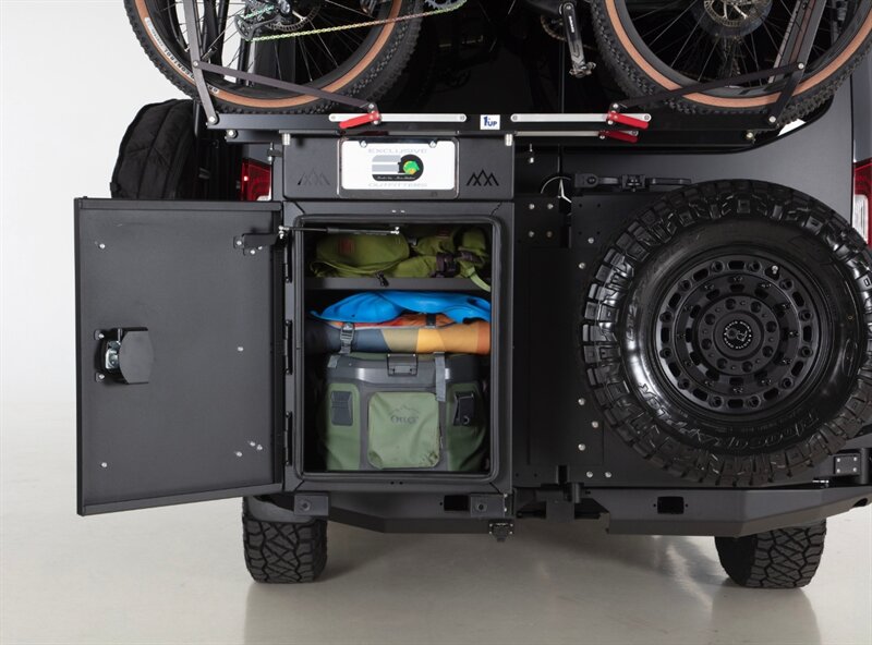 • Aluminess Rear Bumper w/ Utility Storage Box + Full-Size Spare Carrier